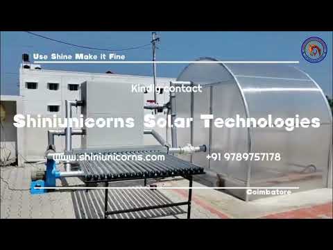 Shini Unicorns Solar Technologies Pvt. Ltd. has developed a Solar–Heat Pump Hybrid Dryer that integrates a jet impingement–based solar air heater with a controlled heat pump system to achieve fast, energy-efficient, and quality-preserving drying of moringa leaves and other agricultural produce. The system consists of a modular greenhouse-type drying chamber of about 150 m² (≈15 m × 10 m) fitted with multi-tier tray racks for uniform airflow, a jet impingement solar air heater with an effective collector area of 25–30 m² using an optimized nozzle plate (Dj/Dh ≈ 0.065, X/Dh and Y/Dh ≈ 0.865) to enhance the Nusselt number and convective heat transfer, and an air-to-air heat pump unit of 7 kW thermal capacity for supplementary heating and dehumidification. A 3 HP centrifugal blower delivers an adjustable airflow rate of 350–450 CFM (0.165–0.21 m³/s) through insulated ducting, maintaining tray-level air velocities of 1.5–3.0 m/s, while PID-based controls regulate the drying temperature within 40–70 °C and chamber relative humidity between 15–40%. The dryer handles 200 kg of moringa leaves per batch with a drying time of 6–7 hours to a final moisture content of 5–7% (wb), and 150–250 kg of products such as small onions, garlic, turmeric slices, chilies, fruits, and herbs in 8–14 hours, depending on bulk density and slice thickness. Technically, the jet impingement mechanism intensifies turbulence and thins the thermal boundary layer on the absorber plate, yielding higher outlet air temperatures and faster drying kinetics than conventional duct-type solar heaters, while the heat pump stabilizes temperature and humidity during low-solar periods and recovers latent heat from moisture condensation. The hybrid configuration reduces conventional energy consumption by 40–70%, enables uniform and continuous drying independent of weather, minimizes case hardening and nutrient loss by operating at moderate temperatures, and consistently delivers export-grade dried products with improved color, bioactive retention, and shelf life, making it a scalable, low-carbon solution for on-farm and small-to-medium agro-processing applications.
